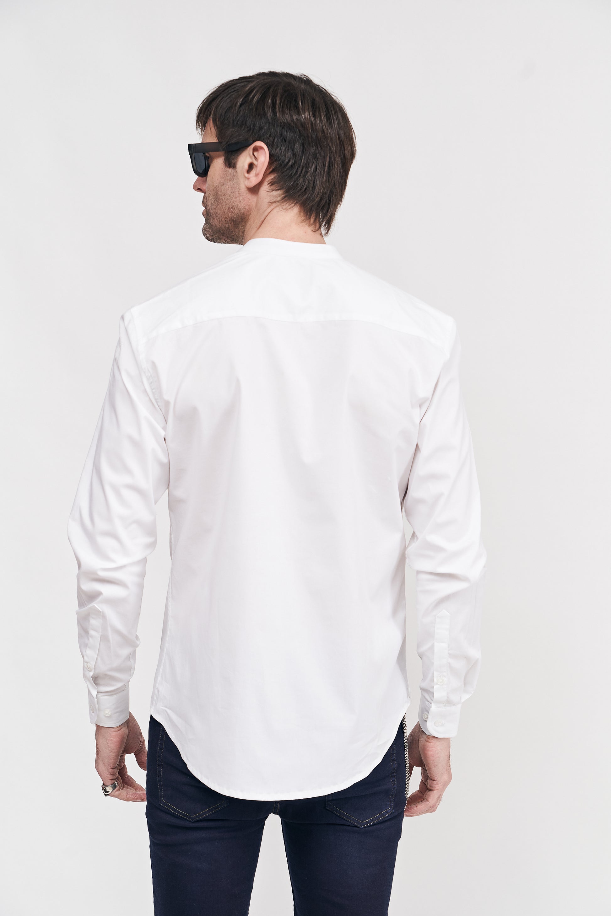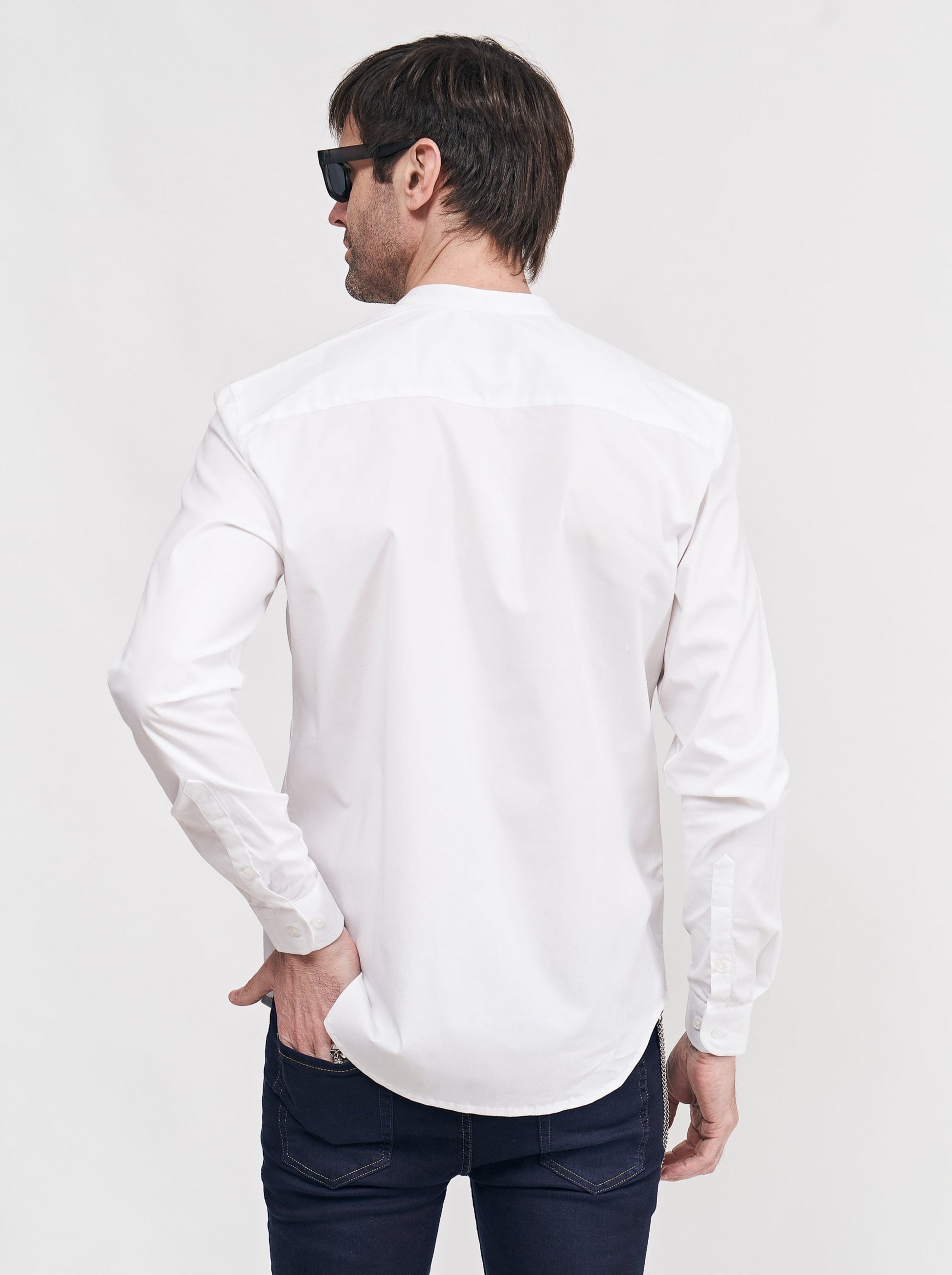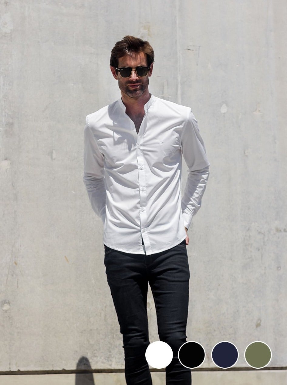 La clave de muchos de nuestros outfit es la sencillez de las prendas elegidas. La prenda superior eligiendo esta camisa de cuello Mao, en colores lisos juegan un papel fundamental en generar un look con estilo minimalista y adecuado para descontracturar. Puede ser combinada tanto con jeans, pantalones chinos, pantalones pinzados, sacos en todas sus variantes de telas pero siempre con un corte slim, para asi lograr elegancia y sofisticación.